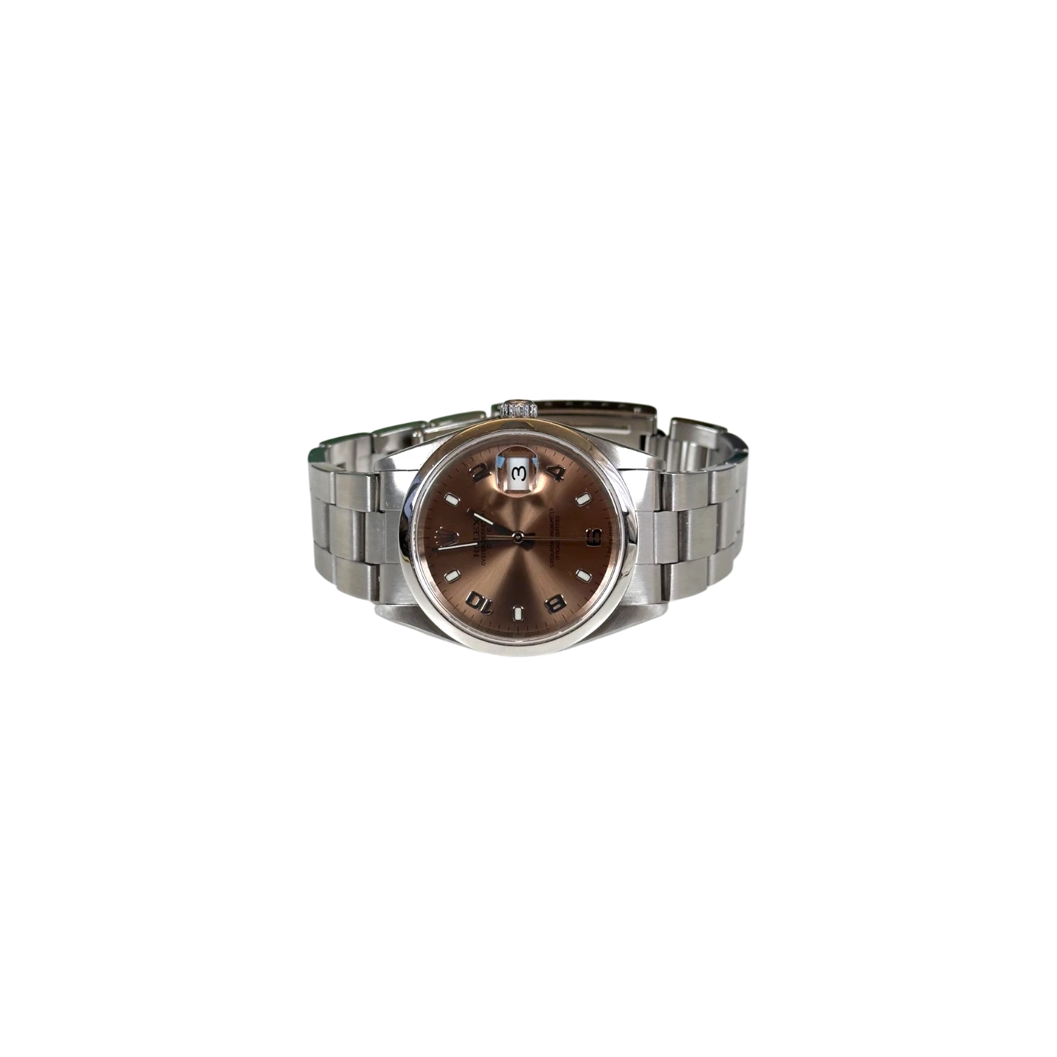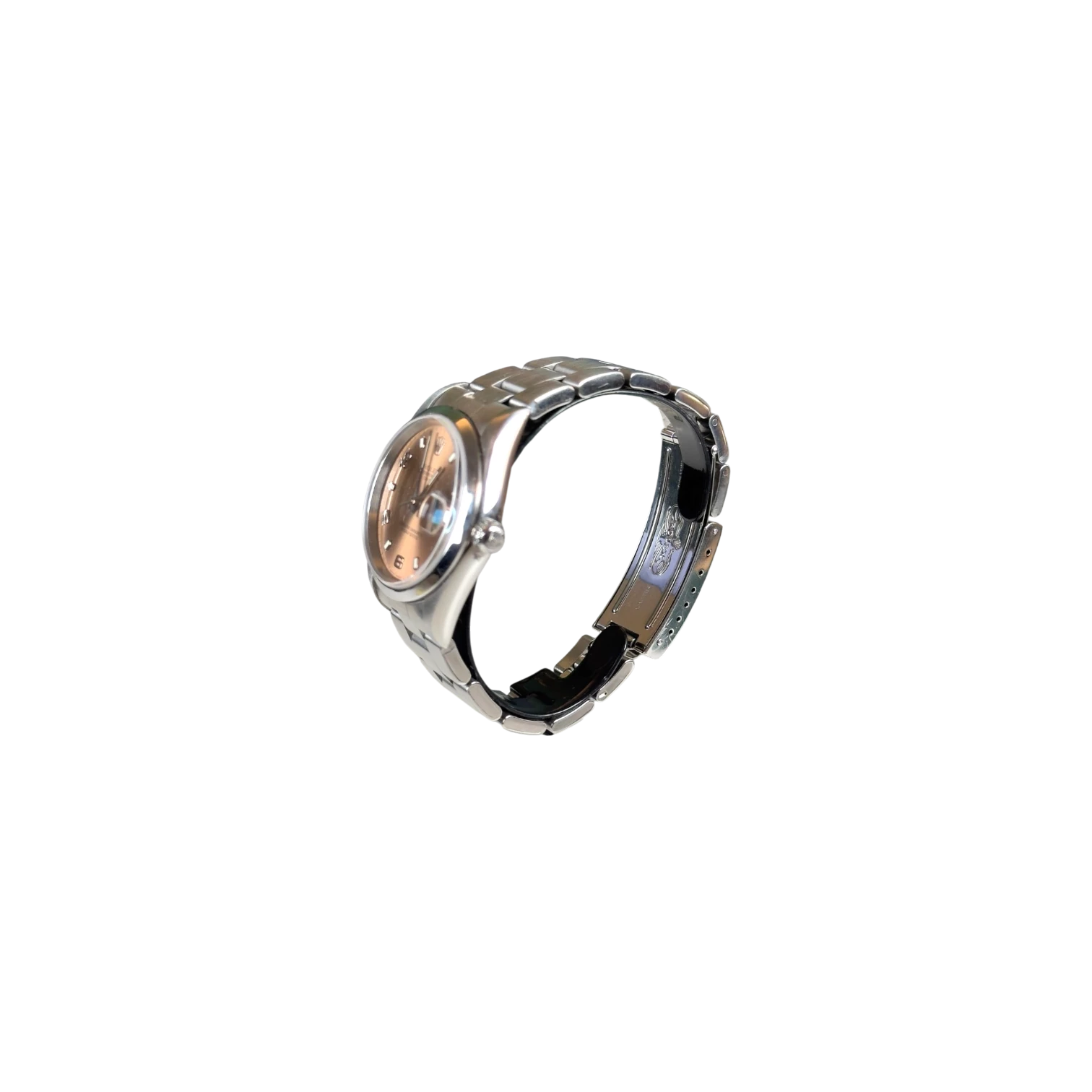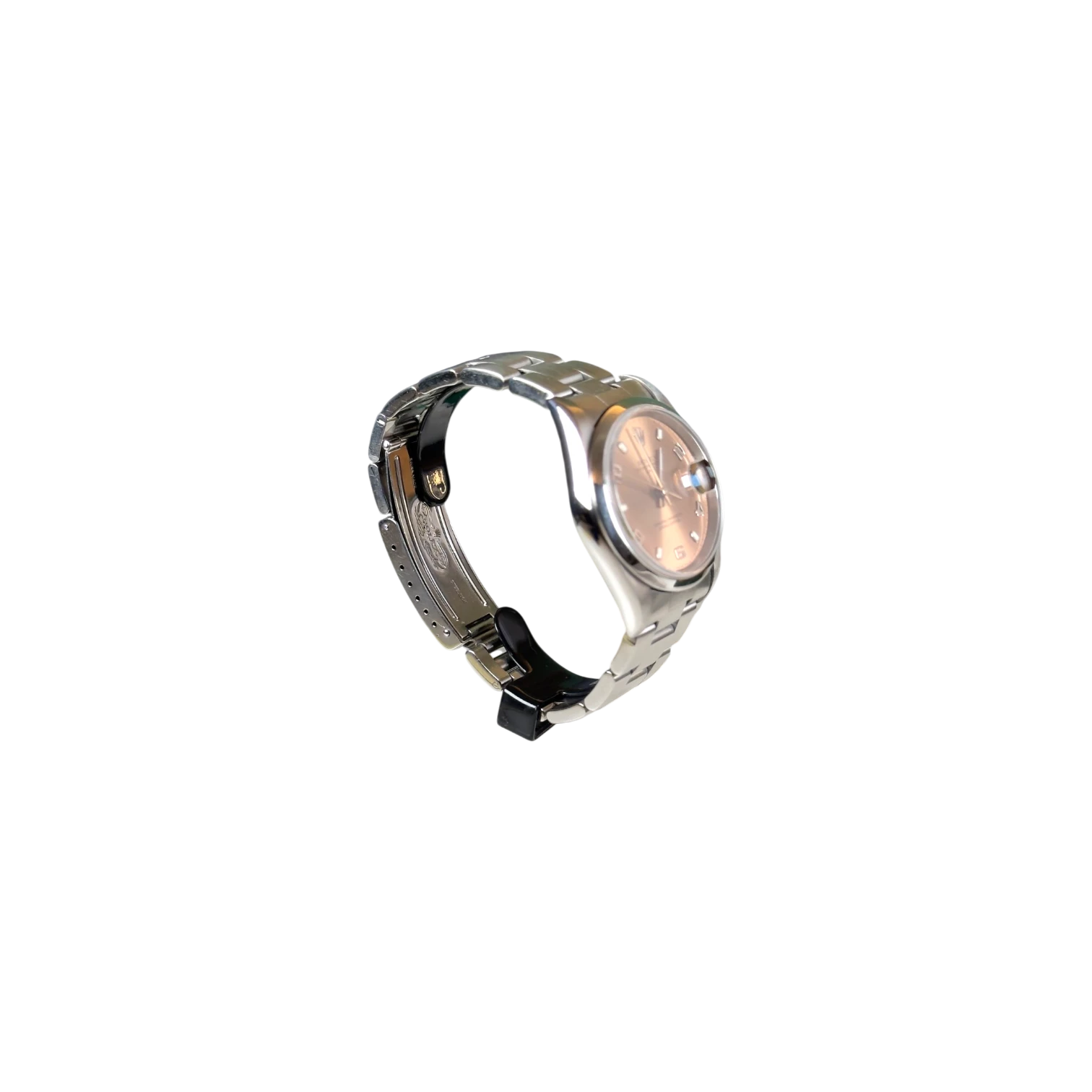 Questo Rolex Date 15200 pink dial presenta una cassa Oyster da 34 mm in acciaio con lunetta liscia, una configurazione equilibrata e versatile. Il quadrante con indici applicati garantisce ottima leggibilità e un design pulito, perfetto per un utilizzo quotidiano.