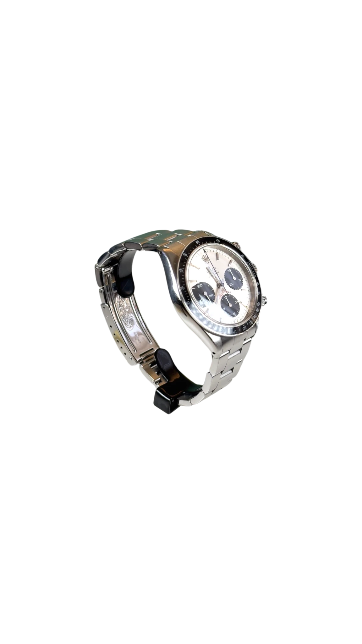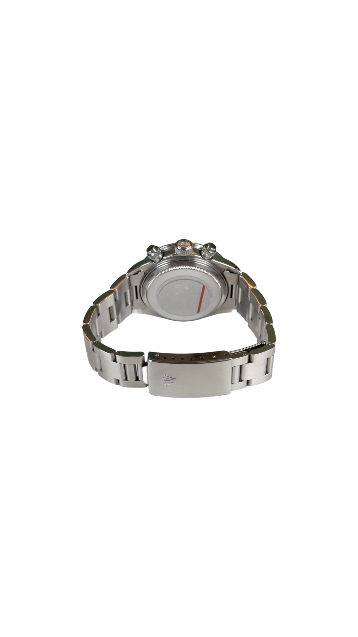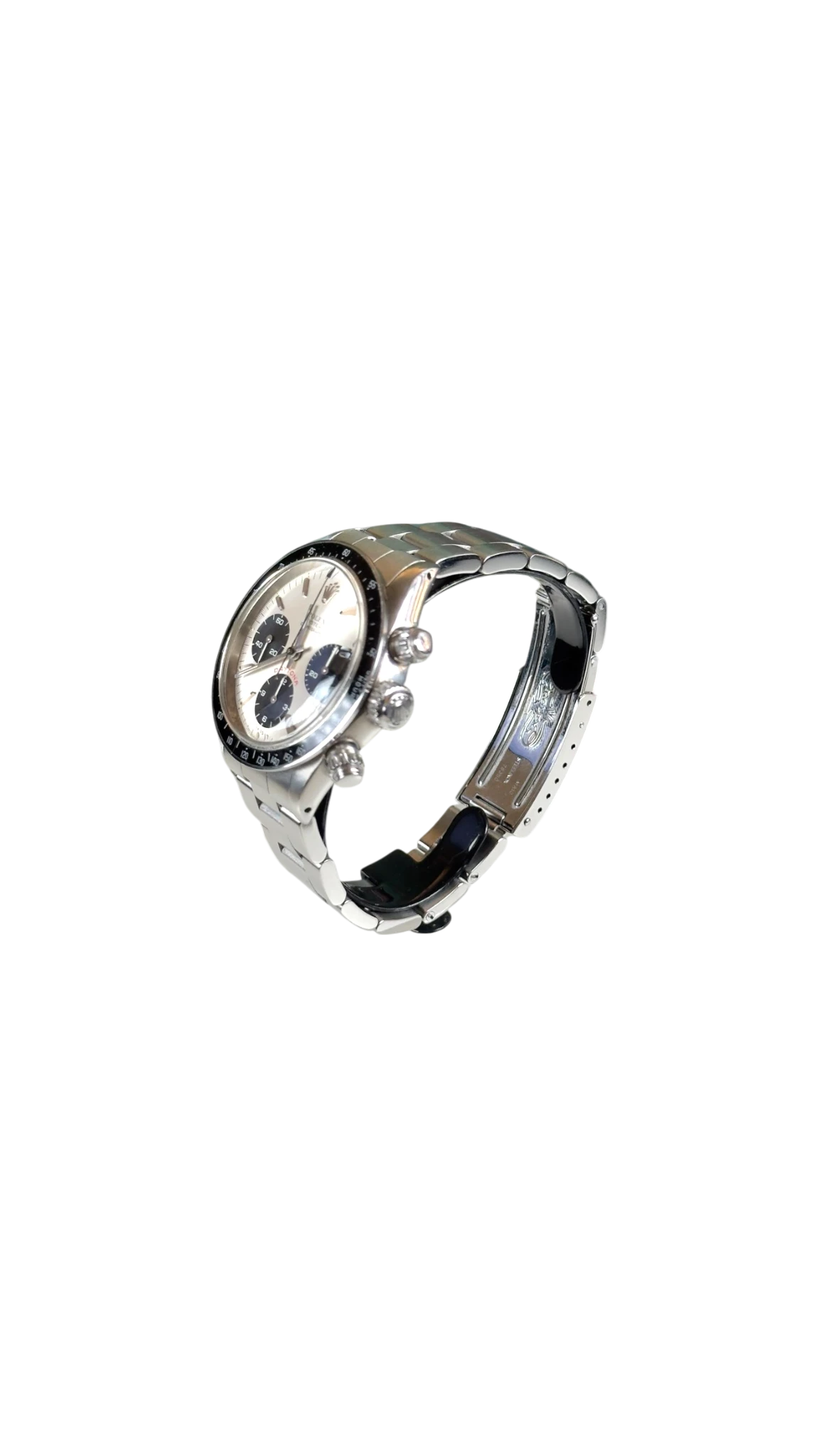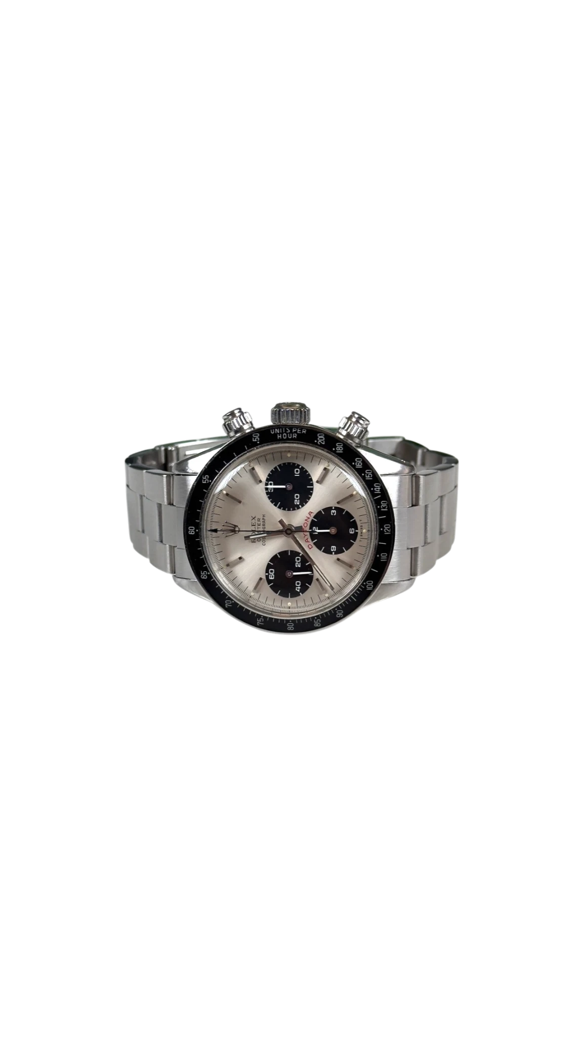 Il Rolex Cosmograph Daytona 6263 presenta la classica configurazione cronografica con contatori a contrasto e la robusta cassa Oyster in acciaio con pulsanti a vite, elementi che hanno reso questo modello uno dei Daytona vintage più apprezzati.