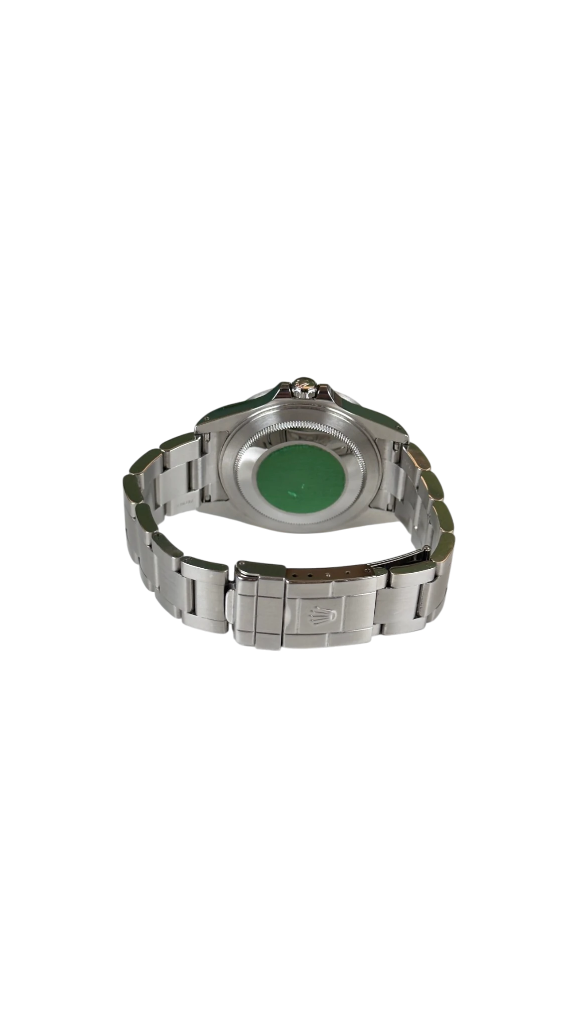 La cassa Oyster da 40 mm in acciaio ospita il movimento automatico Rolex calibro 3185, dotato di funzione 24 ore / GMT, che consente la lettura di un secondo fuso orario grazie alla lancetta dedicata e alla lunetta graduata.