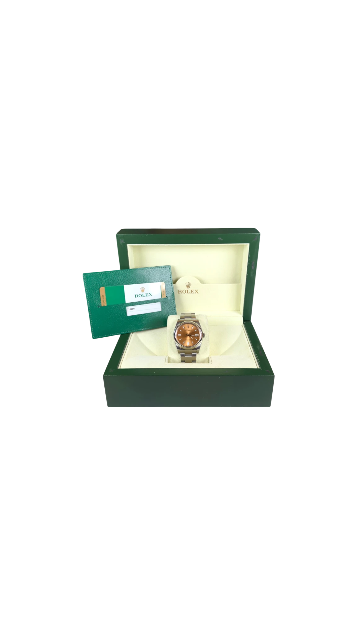Questo Rolex Oyster Perpetual 116000 yellow dial presenta una cassa Oyster in acciaio da 36 mm, dal design pulito e senza tempo. Il quadrante luminoso con indici applicati garantisce ottima leggibilità e uno stile minimalista, perfetto per un utilizzo quotidiano.